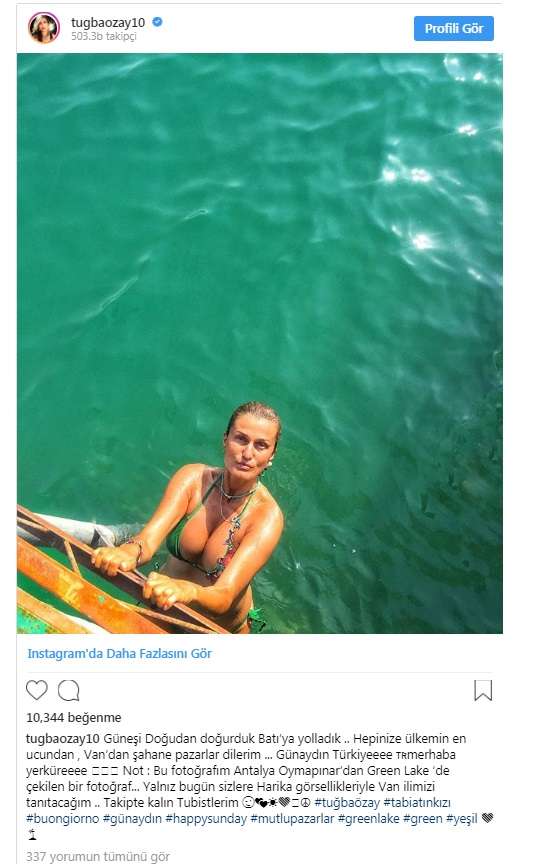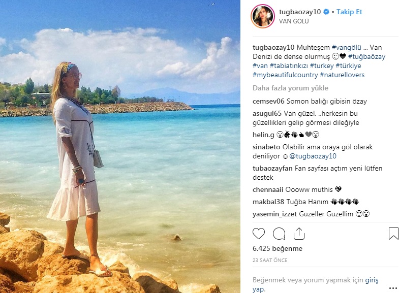 Tuğba Özay Türkiye'yi geziyor. Bikinili paylaşımında Van'da olduğunu söyleyen eski manken: "Güneşi Doğu'dan doğurduk Batı’ya yolladık .. Hepinize ülkemin en ucundan , Van’dan şahane pazarlar dilerim" dedi.