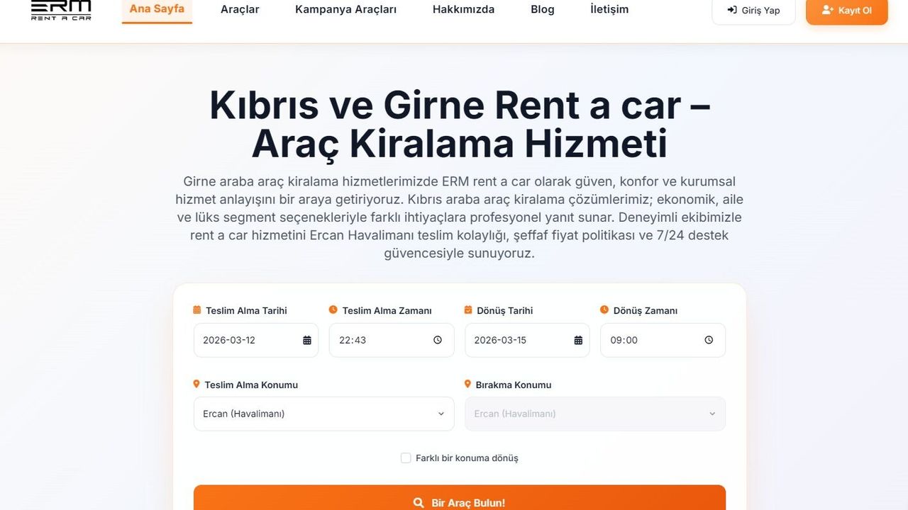 Kuzey Kıbrıs’a uçakla gelen ziyaretçiler için Ercan havalimanı araç kiralama hizmeti büyük bir kolaylık sağlar. ERM Rent A Car, havalimanında sunduğu hızlı araç teslim hizmeti ile yolcuların adaya iner inmez araçlarını teslim almasına olanak tanır.